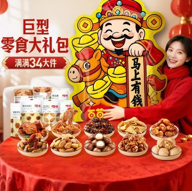 百草味作为国民零食品牌,品质有保障,马年限定零食大礼包采用喜庆红色包装,印有骏马吉祥图案,寓意美好,礼盒设计精致大气,手提便捷,内置30+款精选零食,涵盖坚果、果干、肉脯、糕点等多种品类,低糖低脂配方更符合现代健康理念,避免甜腻负担,老人小孩都能放心食用,适配新年聚会、走亲访友、居家休闲等多场景。