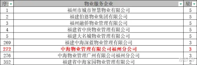 2025年12月31日,市房管局公布了《福州市2023—2024年度物业服务企业星级评定结果》,全市371家物业公司参与评定,中海物业管理有限公司福州分公司排在第272位,物业服务水平仅为三星级。