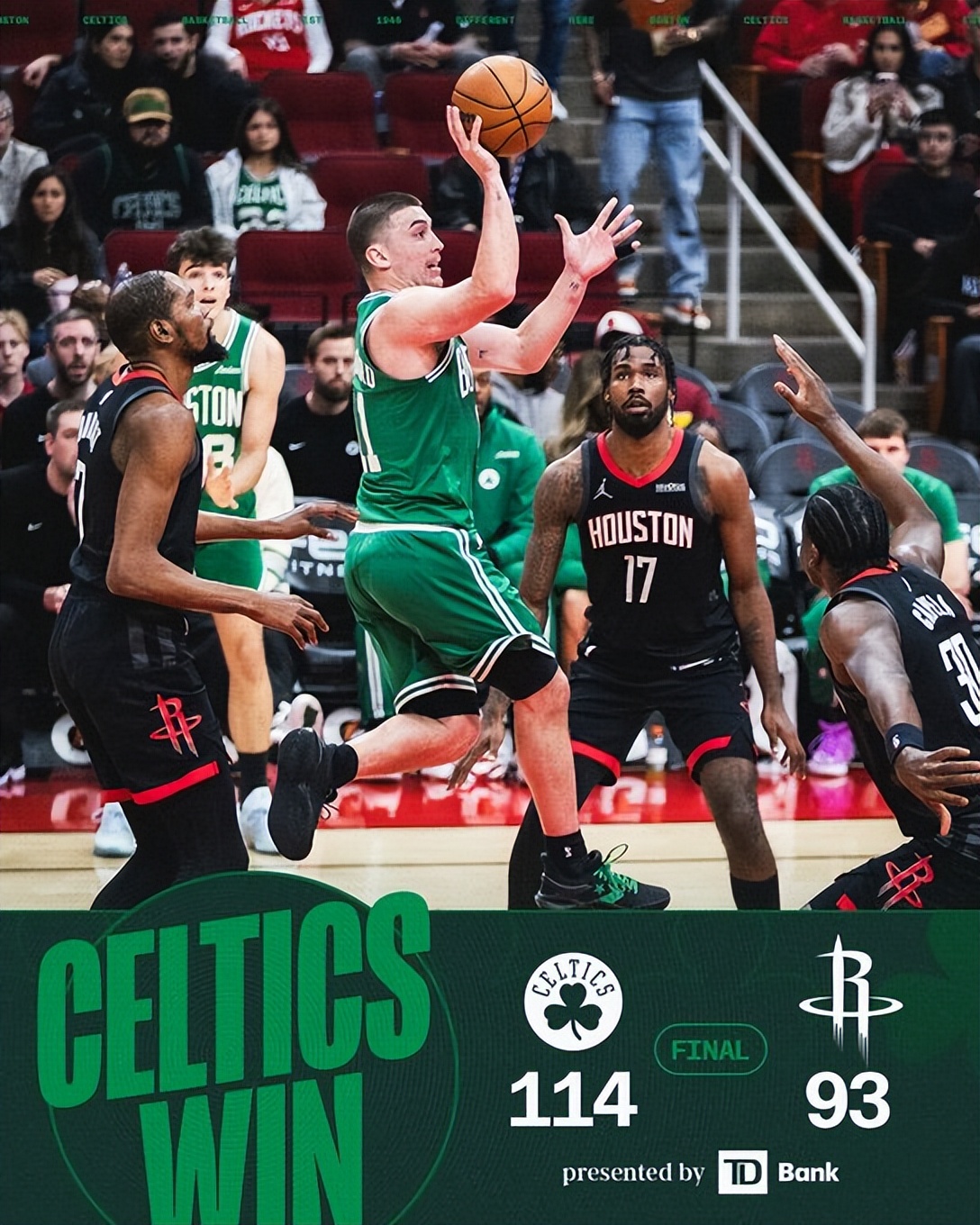 凯尔特人今天在快船以114-93战胜火箭,取得一场21分的大胜,也取得4连胜,并且终结了火箭的三连胜。绿军战绩来到33胜18负,再次和尼克斯打成平手,继续排在东部第三。而火箭战绩来到31胜18负,继续排在西部第四。