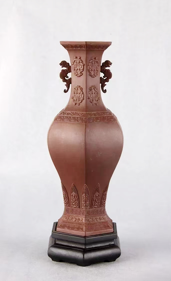 技术革新:突破“朱泥无大器”限制,以珍稀朱泥创作《蟠垆壶》等大件作品,采用“大红袍”烧制工艺,器型雍容华贵。