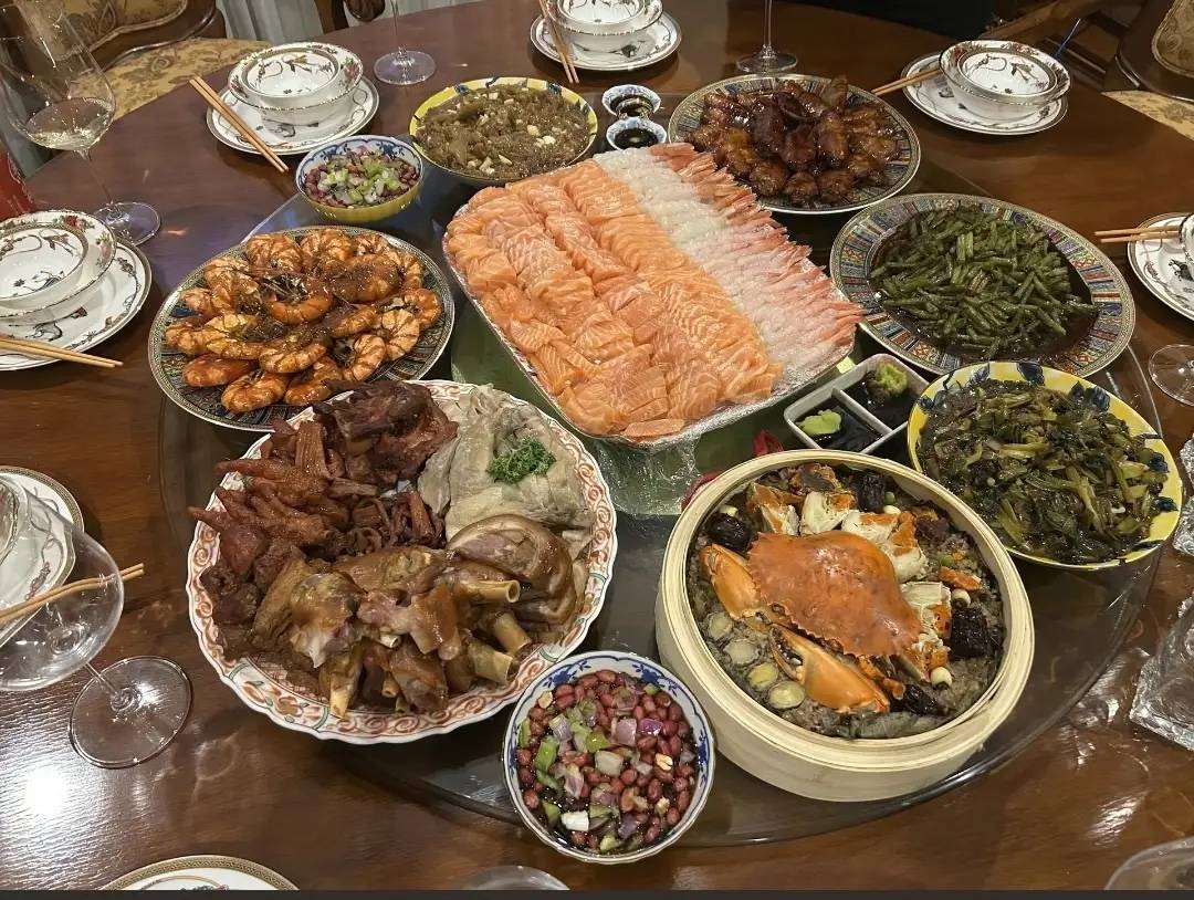 他们余聚餐的时候,菜品还是非常丰盛的,有三文鱼大虾刺身拼拍,还有整只的大螃蟹,佛跳墙、热气腾腾的海鲜锅等等。