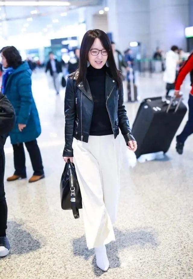 这套造型中,黑色皮夹克自带酷感,金属拉链和翻领设计更是增添了街头感,内搭黑色高领衫非常显瘦,下半身的白色阔腿裤则用纯净的白色中和了皮夹克的硬朗,宽松的版型让整体更显轻盈,也巧妙地包容了身材。