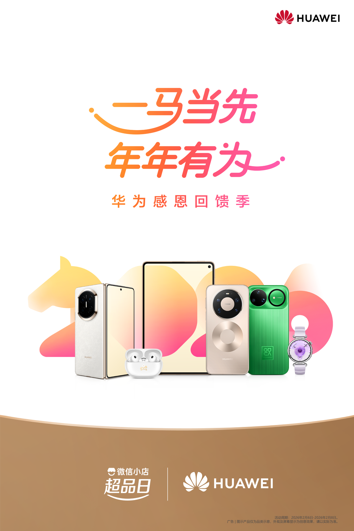 说到这儿,2月6日-8日,微信小店将开启华为超级品牌日活动,可以给亲朋好友赠送限量礼盒,比如日照金山礼盒、周大福礼盒、FreeBuds Pro 5马年典藏版、WATCH GT6情人节礼盒、一马当先通用礼盒,下单后对方就能能收到“蓝包”提醒,有礼又有面。大家也可以在这几天去指定店铺(华为跃享、华为奕数、华为弘执、华为辰扬互联、华为手机专卖店)抢购Mate 80 Pro/Mate 80 Pro Max/Mate X7等爆款新品,作为给自己的新春礼物。
