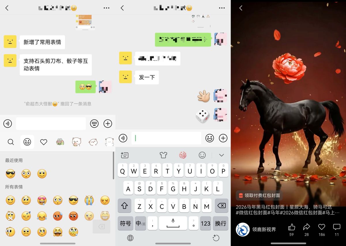 当然,这次更新可不止这些亮点。在聊天社交方面,新增了常用表情,和支持石头剪刀布、骰子等互动表情,让群聊互动更热闹;视频号也支持了短视频领取红包封面和直播福袋等功能,真真是把春节的氛围拉满了。