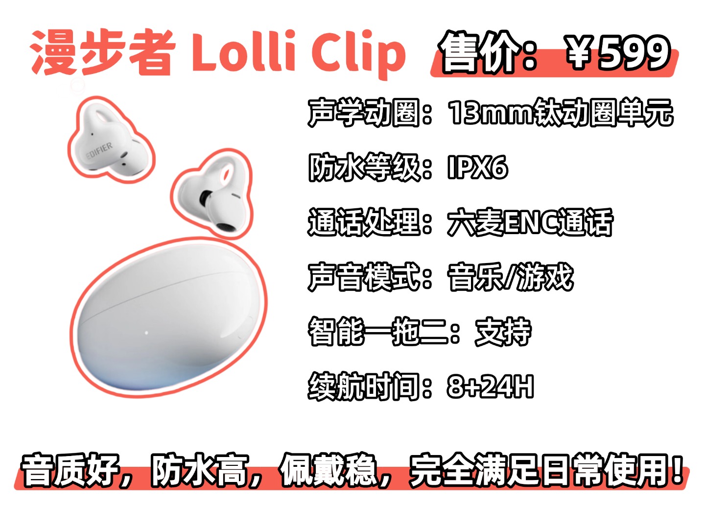 漫步者 Lolli Clip价格:599元推荐理由:音质好,防水强,同价位质感突出,日常使用完全足够!