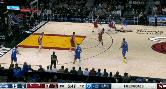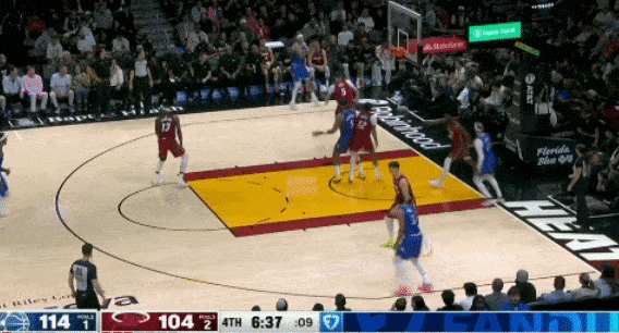 班切罗弧顶持球,萨格斯上提掩护,布莱克反跑篮下,直接完成空接扣篮。(Backdoor Cut)