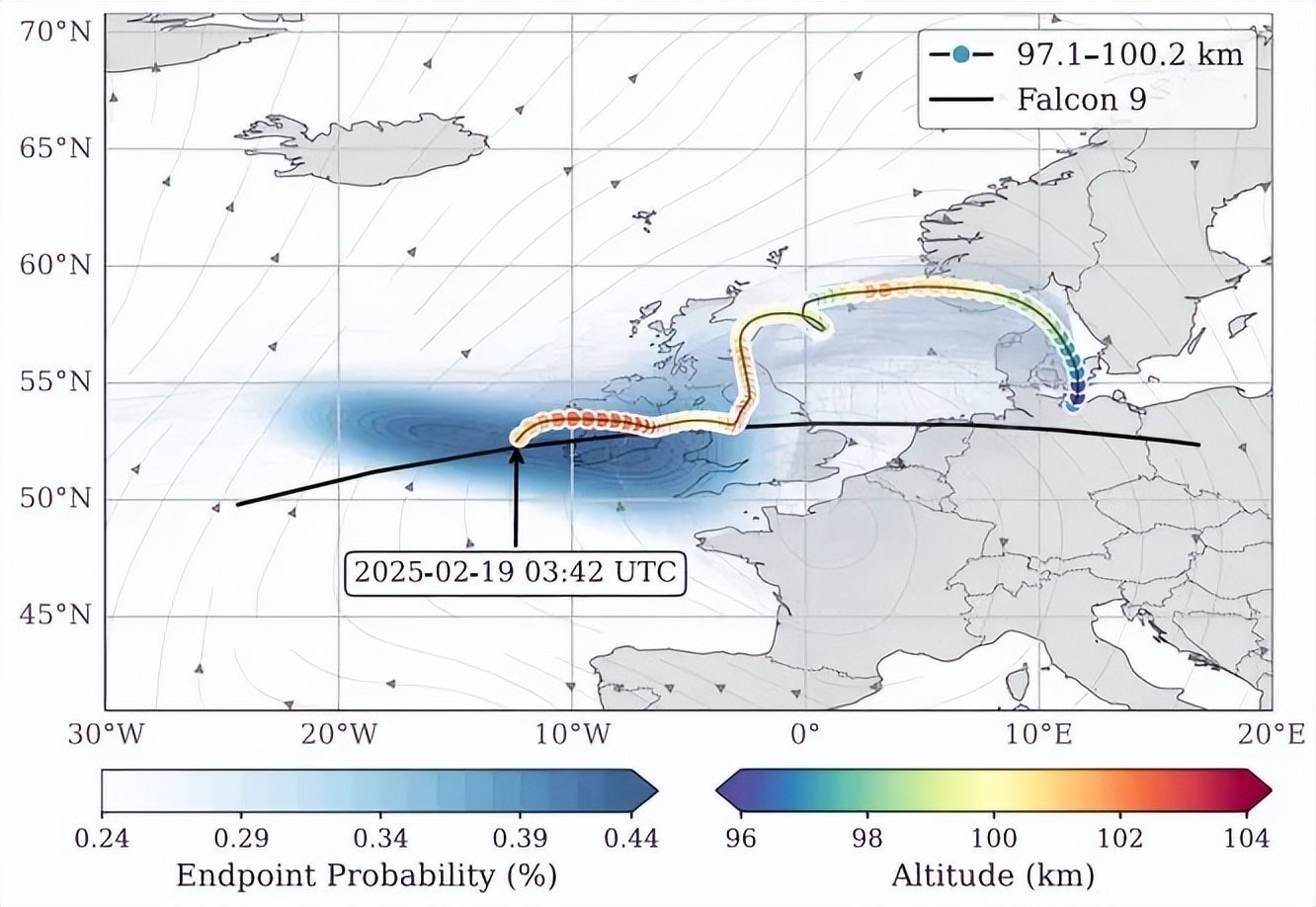 计算结果显示:2025 年 2 月 19 日凌晨 3 点 42 分左右,这团空气正好位于爱尔兰西海岸处的 100 公里高处。同一时刻,猎鹰 9 号的残骸正拖着火焰穿过那个点。时间吻合,位置吻合,高度相差不到两公里。