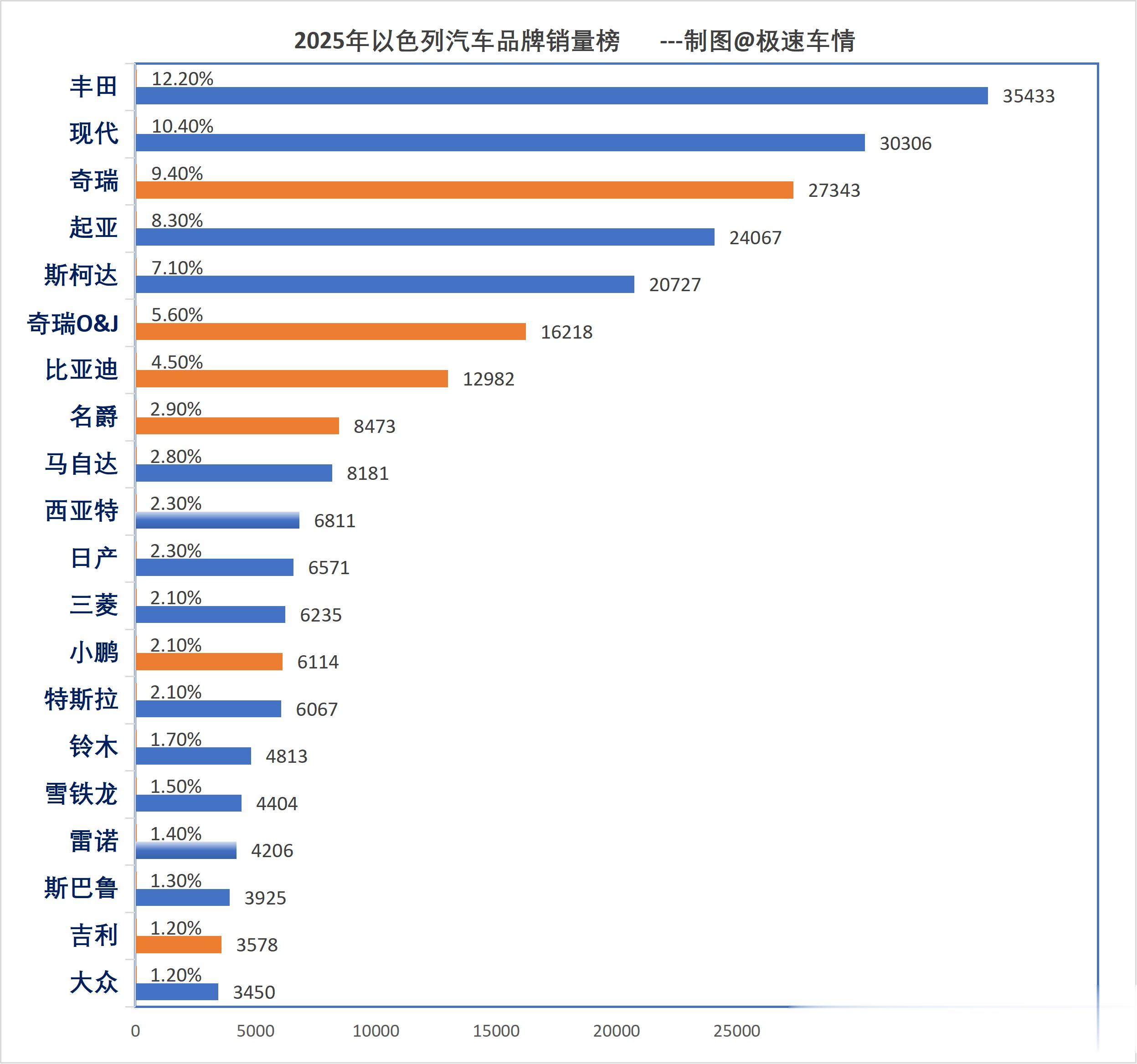 大家好,这里是极速车情。今天为大家带来以色列汽车市场2025年度的销量数据报告。