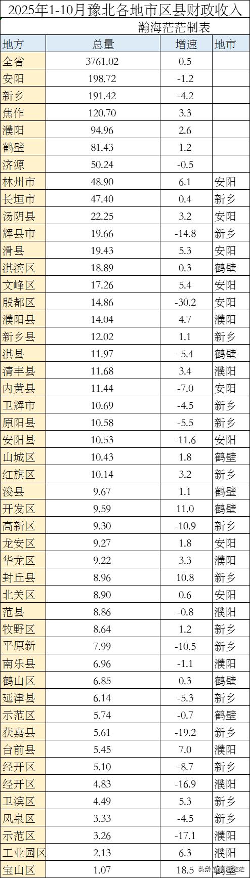 2025年1-10月豫北各地市一般公共预算收入和安阳、鹤壁、新乡、濮阳各全县一般公共预算收入已经全部出炉,我们简单了解一下吧。