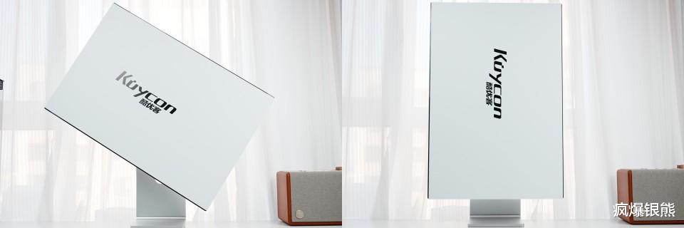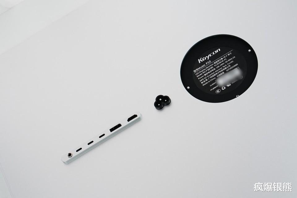 回到显示器,酷优客P10采用上开口设计,比常见的抽拉式方便很多,。因为采用了镜面屏,为了避免刮花,显示器出厂自带防护贴纸如上图白色部分。