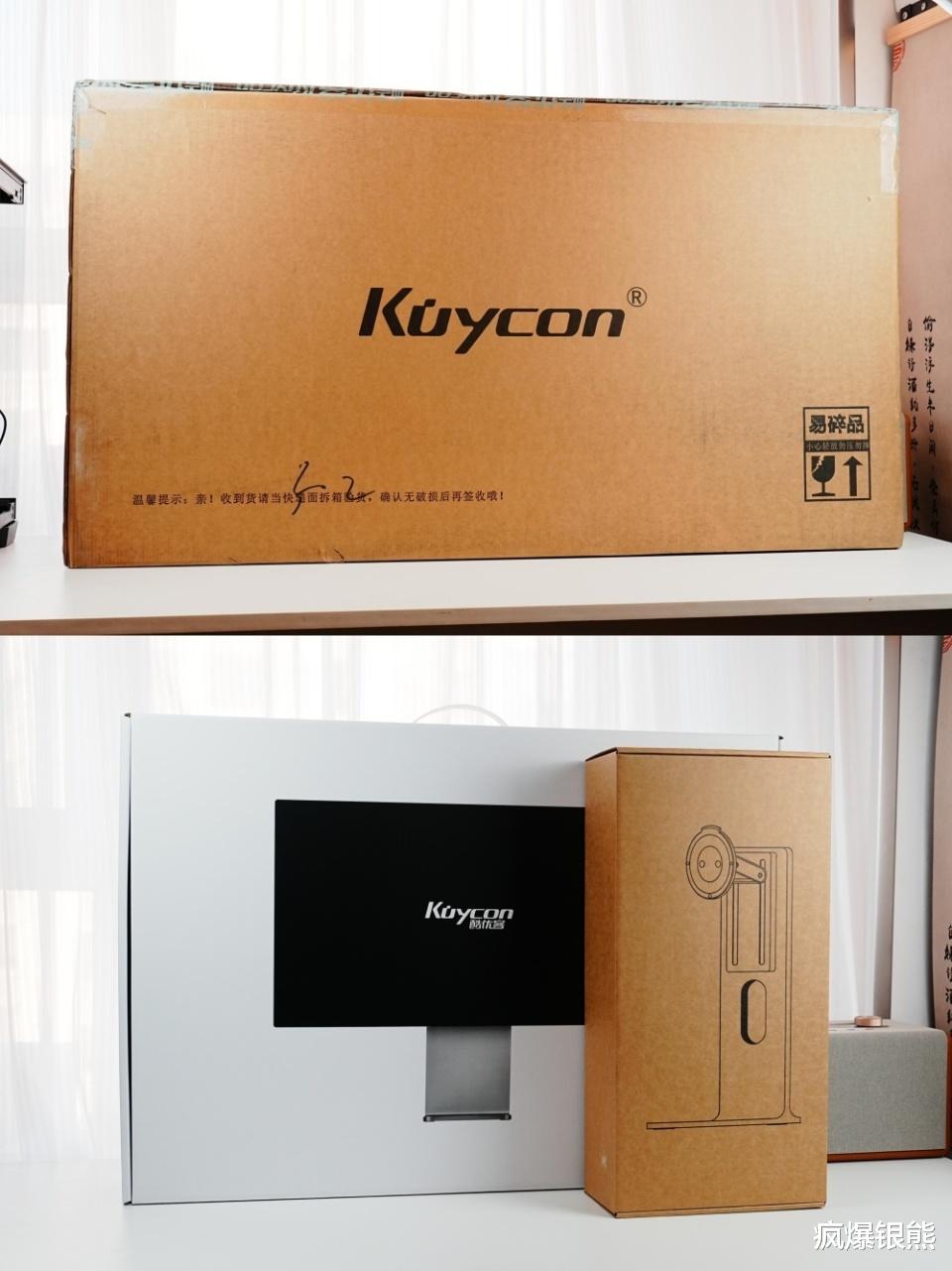 酷优客P10显示器官方有三个版本,如果你有VESA挂架,那可以选择无支架裸机款,另外其还有固定可旋转支架款,还有支架可升降和旋转版。这里我入手的是带有升降旋转支架款。外包装支架款采用了双层包装,牛皮纸箱内部显示器和支架采用独立包装。显示器包装上面设计有提手,方便用户搬运。