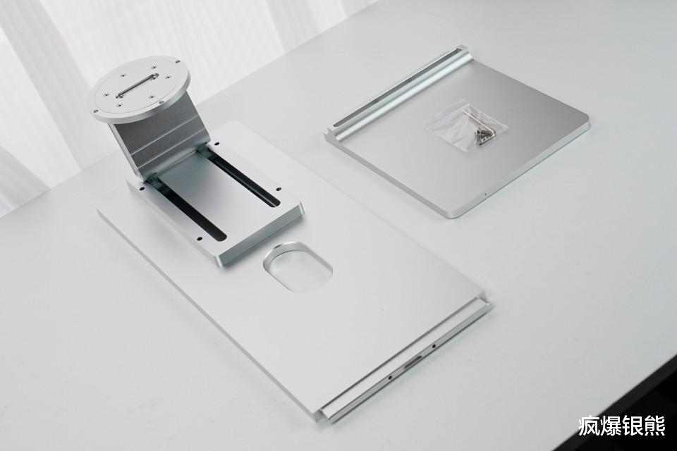 显示器和支架之间固定非常简单,只需一颗螺丝用手拧紧就算安装完成。无论是支架还是挂架与显示器的连接处均采用了全铝合金材质,所以固定后显示器和底座之间非常稳固,一体性也高。