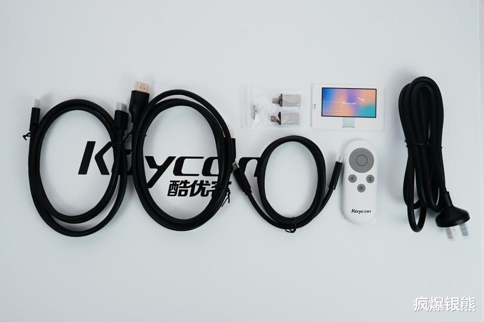 显示器配件给的很丰富,除了HDMI2.1数据线和DP1.4数据线外,还有一根全功能Type-c数据线,有一个遥控器用来调出OSD菜单,一个U盘说明书,两个C-A转接器及电源线一根。