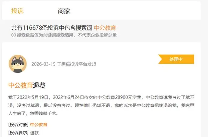 中公教育的“不过包退”模式曾是其吸引学员的主要方式,但现在却成了信任危机的导火索。黑猫投诉平台的相关投诉已经超过11万条,近30天内有281条,其中大部分是关于退款纠纷的。