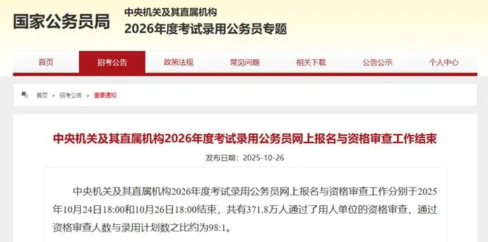 据国家公务员局官网消息,2026年公务员报名中,共有371.8万人通过了用人单位的资格审查,通过资格审查人数与录用计划数之比约为98:1,“千军万马过独木桥”的激烈竞争再次印证了公考之路的火爆和艰难。