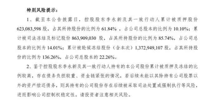 股权全部被冻结的原因在于李永新所牵涉的多起债务、担保纠纷。如果他无法用其他方式偿还债务时,所持有的股份就可能面临被法院执行的风险,从而影响公司控制权的稳定性,给今后的战略调整和危机处理带来较大的不确定性。
