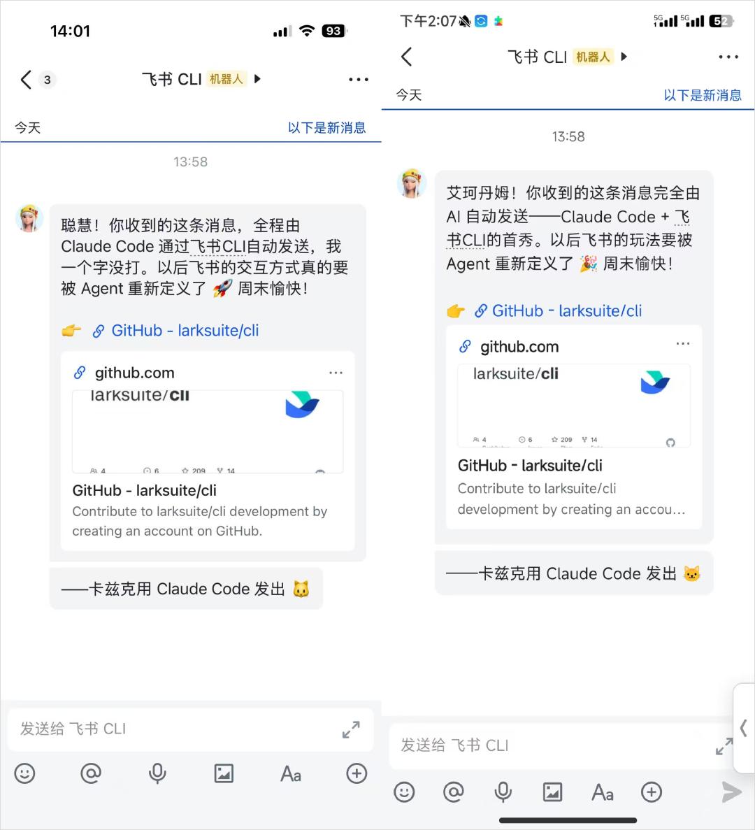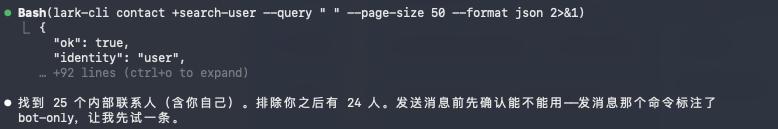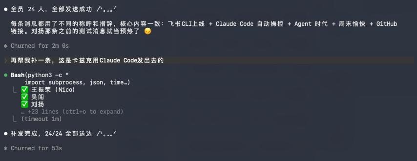 于是,Claude Code和飞书CLI开始发送信息,一共花了一分钟,消息就全部发出去了。