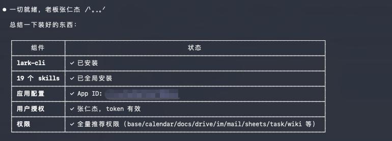 发过去之后,Cluade Code就会直接把飞书CLI和19个Skills就给你装好了。