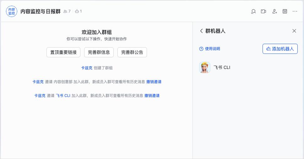 于是,我就直接拉了个群,把飞书CLI机器人也拉了进去。