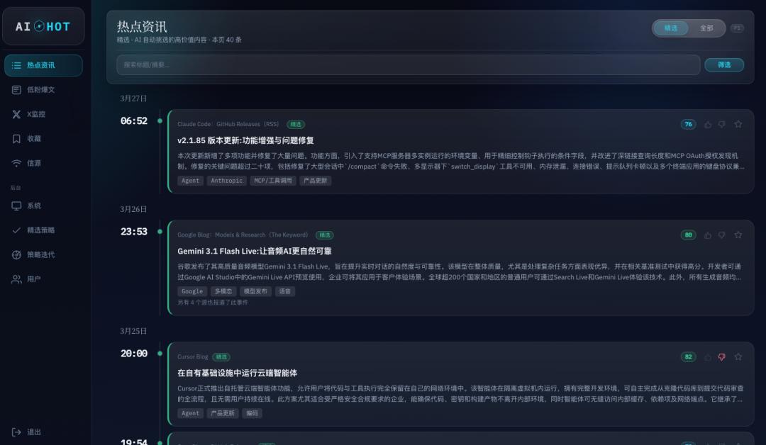 还有一个,我自己也是觉得蛮有用的,还免了我们的开发时间,就是把我自己做了一个给公司内部看的AIHOT热点监控网站。