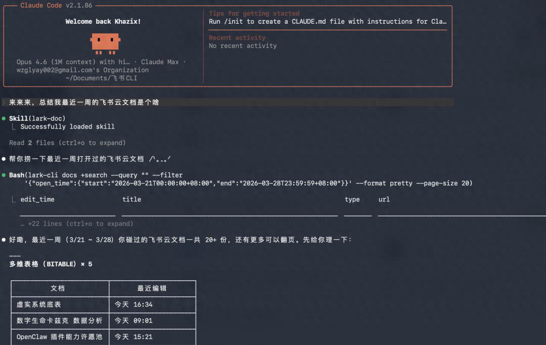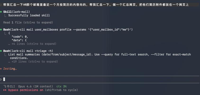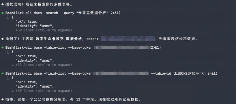 然后我装好飞书CLI后,干的第一件事。