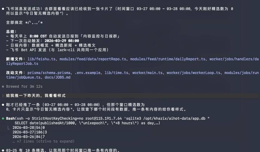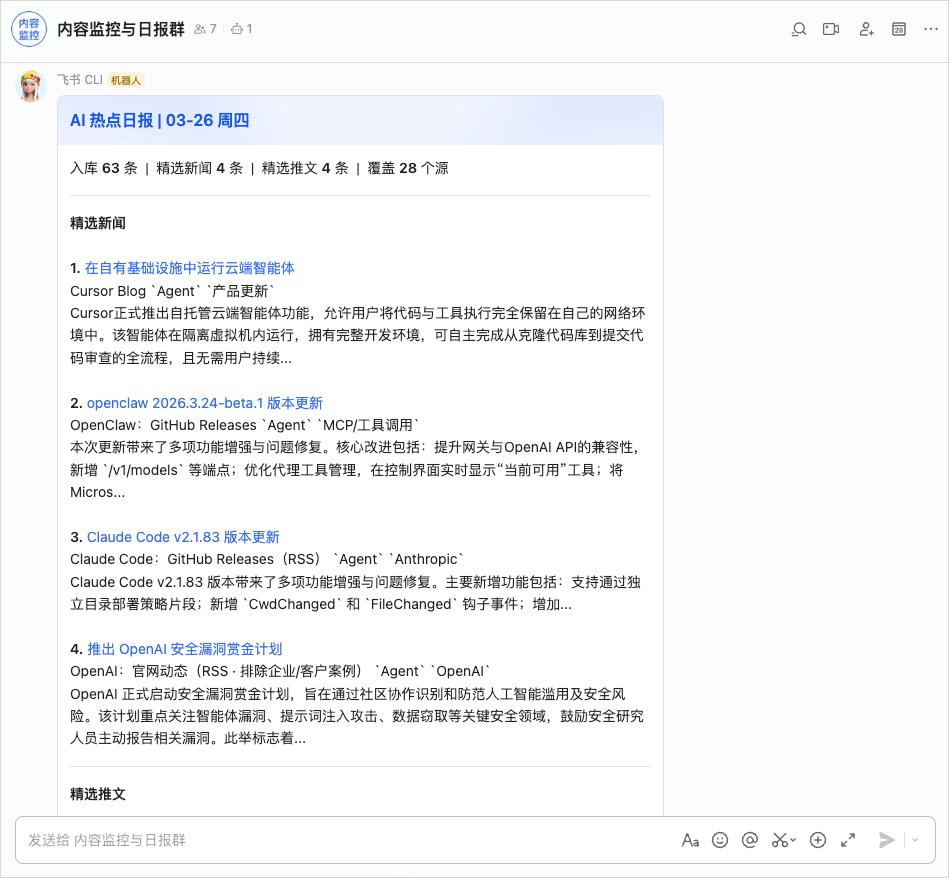 我一直还想做一个飞书日报,每天早上给我们发一份昨天监控的所有信息的汇总日报,之前没啥空开发,跟飞书协同也有点麻烦,现在,完全可以直接干了。