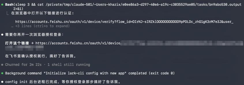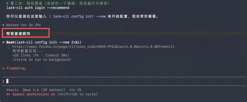 npx skills add larksuite/cli --all -y -g但是因为只是装好了飞书CLI,还没有跟你自己的飞书账号关联上,所以还需要配置一下,你直接让他自己跑就行了。
