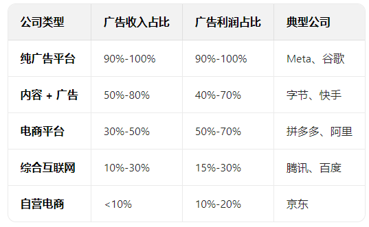 所以大部分互联网平台的核心利润,都来自于广告,占比在20%~100%不等。