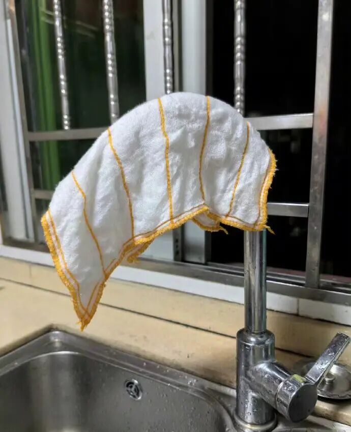 更致命的是,水龙头搭抹布,难看又不卫生,应该给抹布找个隐蔽点的地方挂起来。