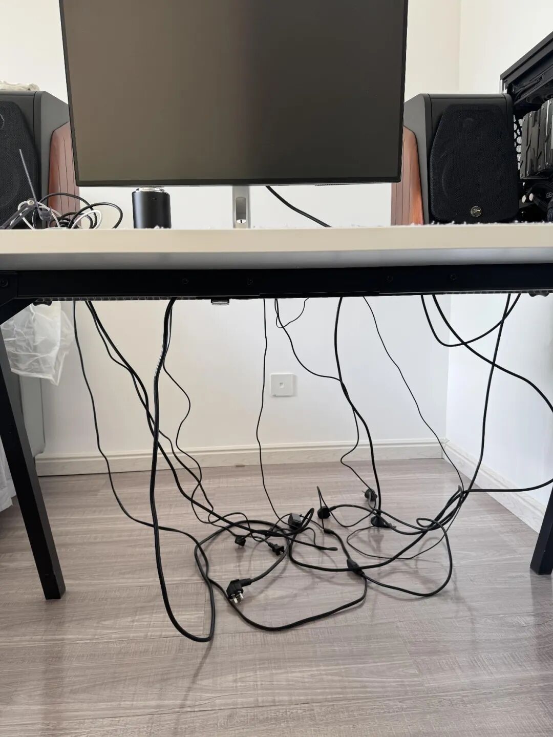 如果必须用台式机,就把插线板用收纳盒固定在桌下,所有线用理线器沿着桌腿内侧走,或者平铺用胶带贴在桌底。