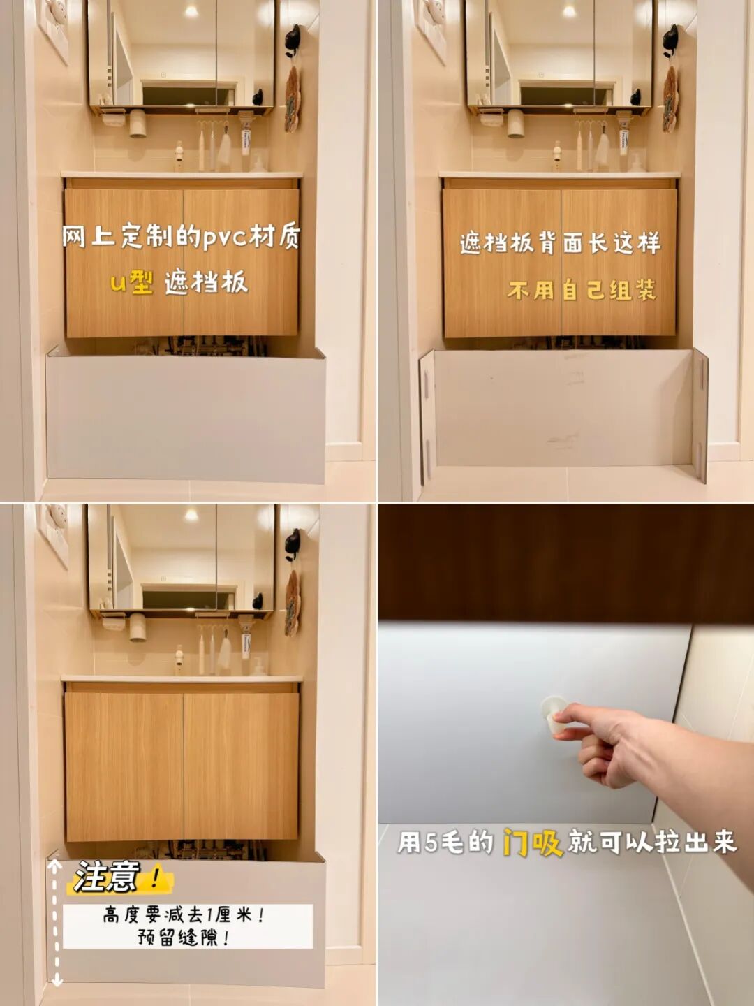 浴室柜底下空出的位置,可以自制一个抽拉架,放塑料盆子和拖鞋等。
