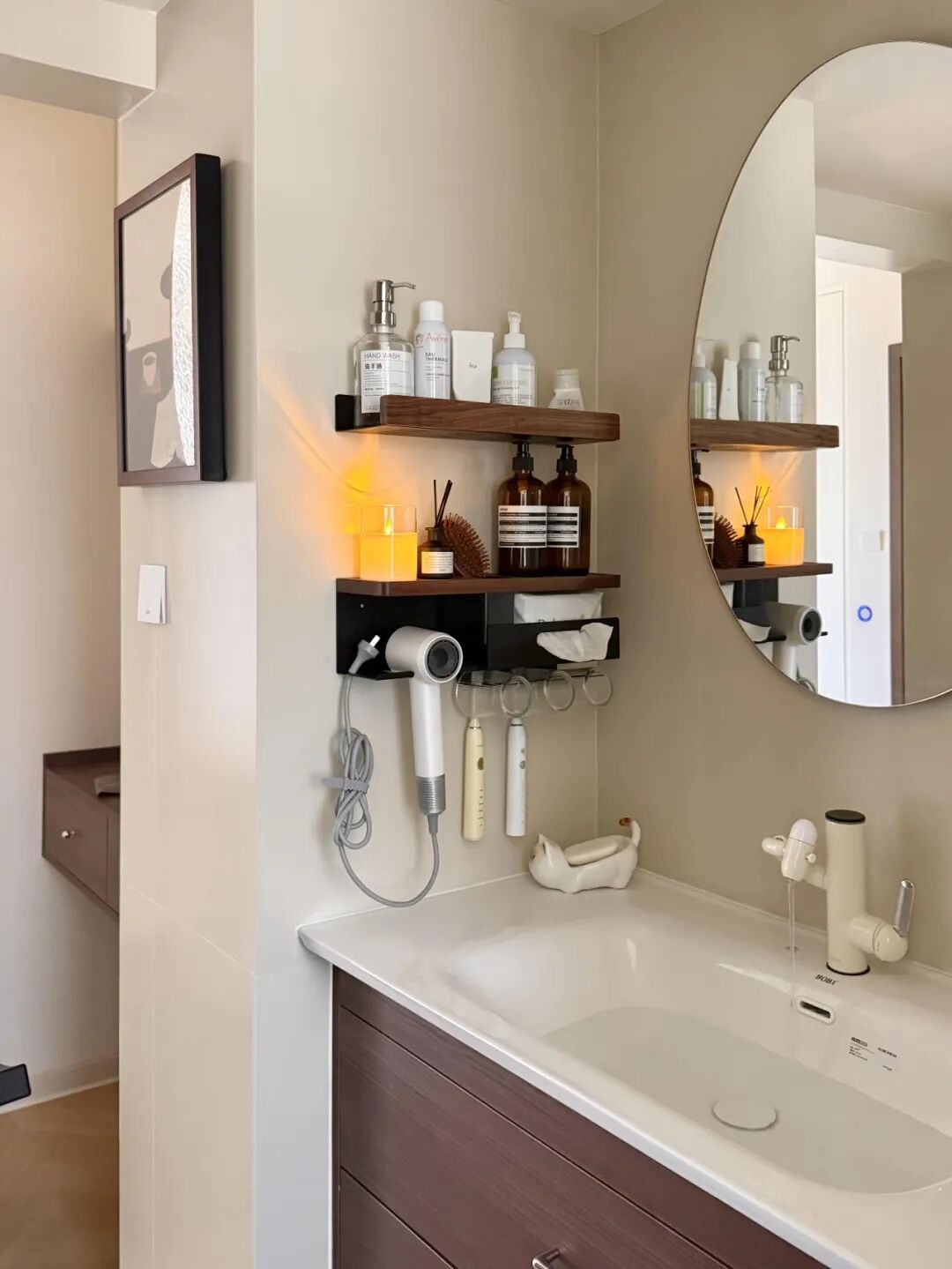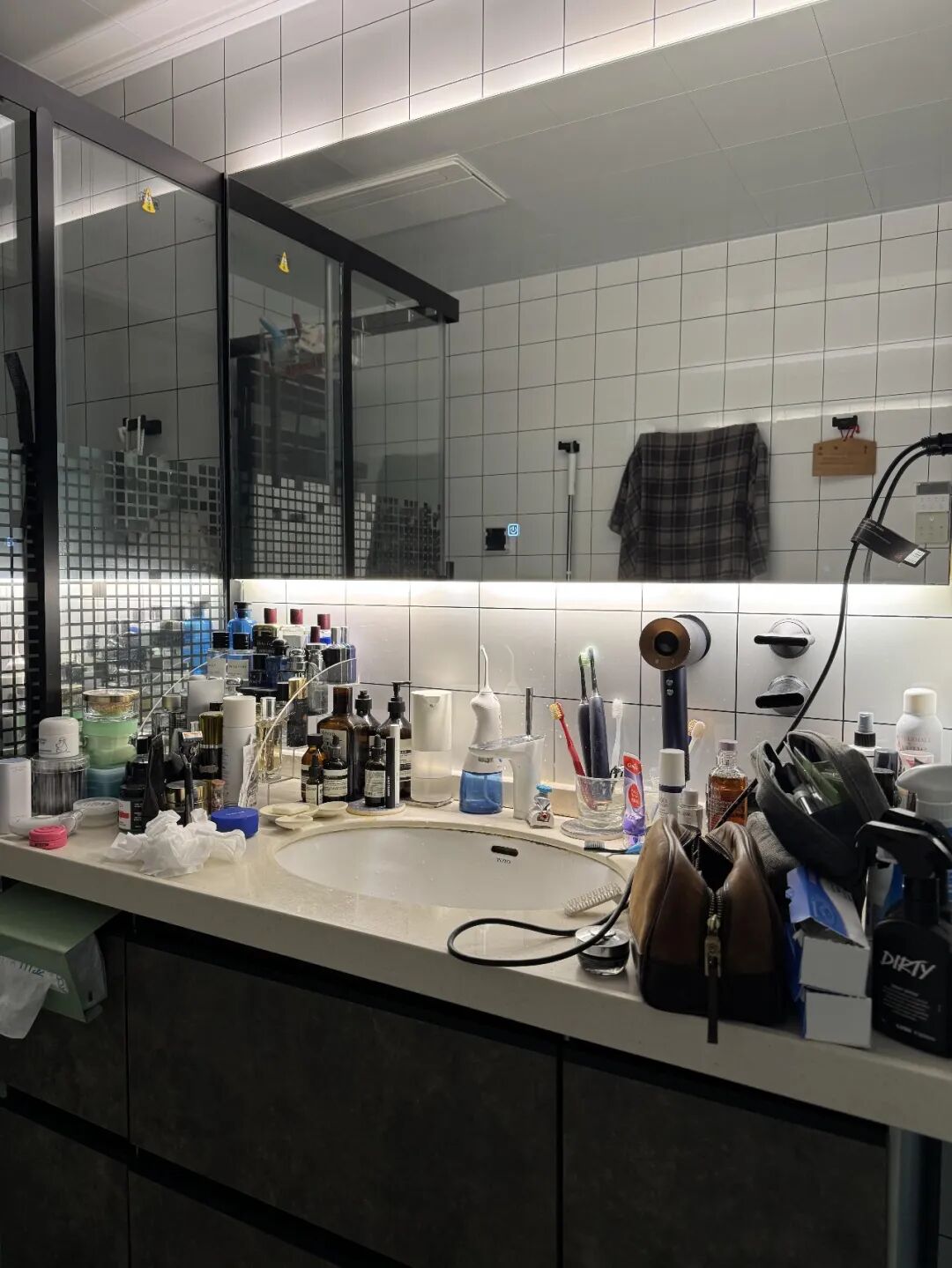 04、浴室柜台面多少人家的浴室瓶瓶罐罐堆满台面,不仅乱,潮湿的环境还容易长霉菌。