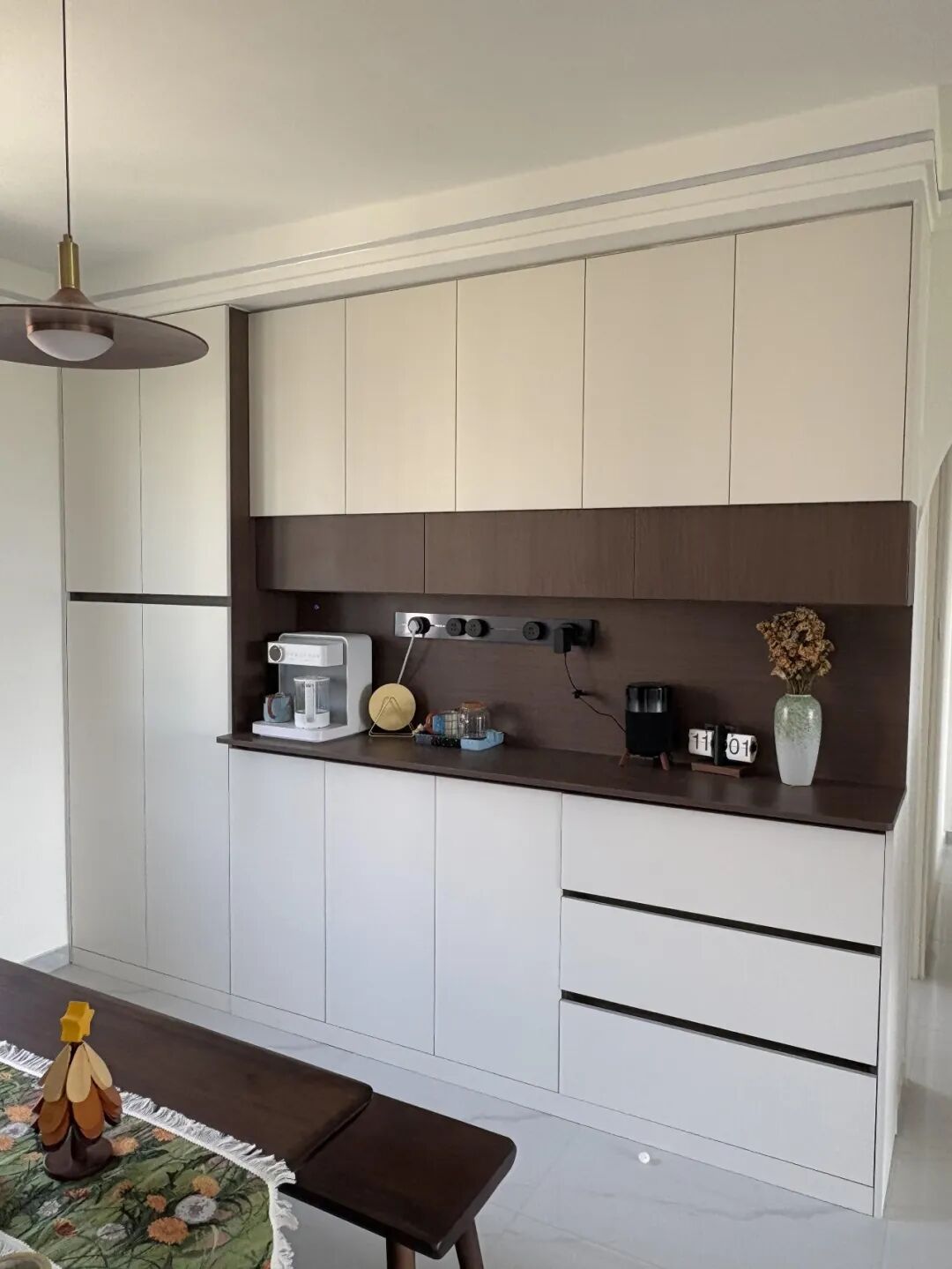 所以,餐厅需要配置一个强大的餐边柜,水杯、纸巾、零食、酒水饮料统统收纳进去,不需要吃饭时再“扒拉”出一块地方。