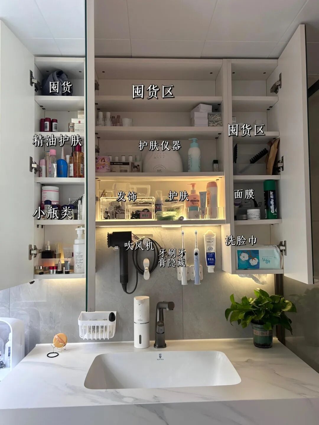 把镜子换成镜柜,只需要十几公分的厚度,瓶瓶罐罐就能全收进去。