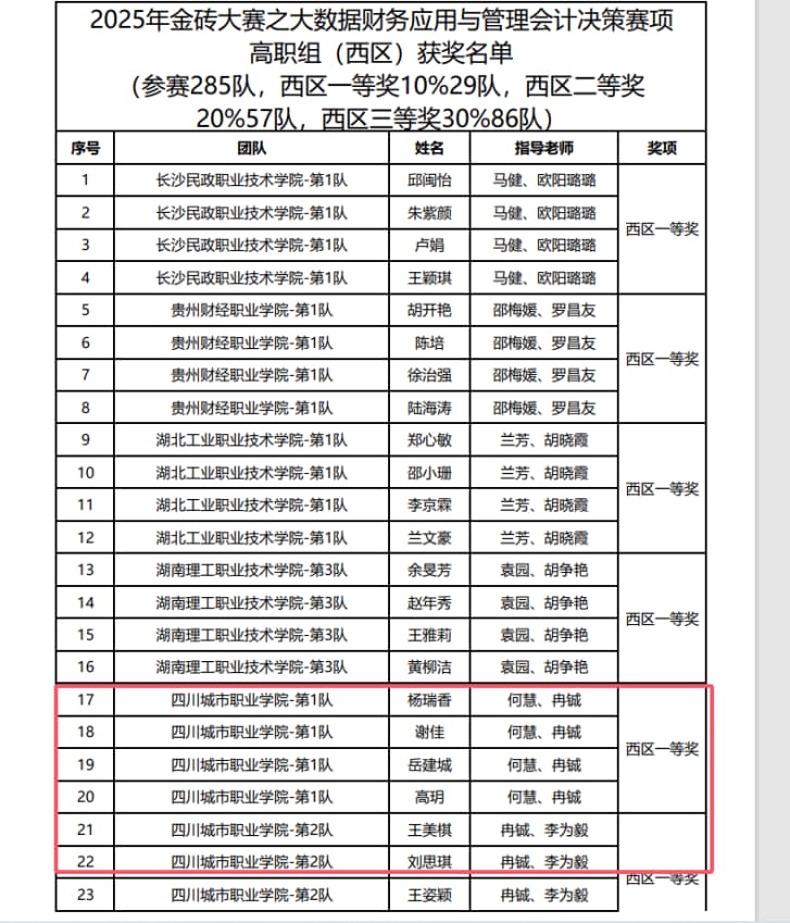 近日,2025年一带一路暨金砖大赛之大数据财务应用与管理会计决策竞赛举行。四川城市职业学院经济管理学院派出的三支参赛队伍均获得高职组(西区)一等奖。