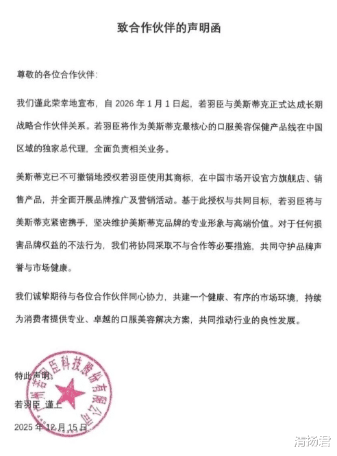 有意思的是,几乎在同一时间,网络上开始流传另一份声明——加盖了广州若羽臣科技股份有限公司(以下简称“若羽臣”,股票代码:003010)公章的声明函。若羽臣在《致合作伙伴的声明函》中宣称,自2026年1月1日起,公司将正式成为美斯蒂克最核心的口服美容保健产品线在中国区域的独家总代理,全面负责相关业务。合同为期三年,还设置了自动续签条款。