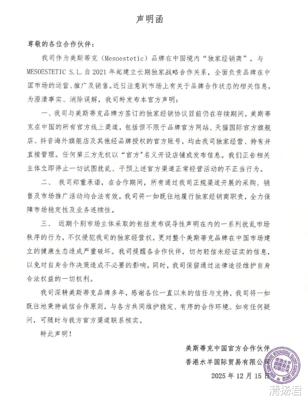 12月15日,水羊集团股份有限公司(以下简称“水羊股份”,股票代码:300740)旗下的香港水羊国际贸易有限公司(以下简称“水羊国际”)发布了一份《声明函》,强调自己仍然是美斯蒂克品牌在中国境内的“独家经销商”,双方自2021年以来的长期独家战略合作关系依然存续。水羊国际称,品牌在中国的所有官方线上渠道,包括天猫国际官方旗舰店、抖音海外旗舰店等,都由水羊国际独家经营、持有并直接管理。