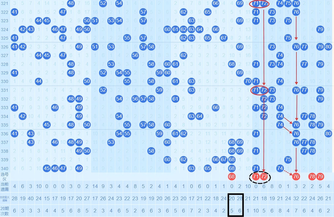 76号也算热号,且近期遗漏没有超过三期,74号开出,下一期76号会相随,相信也不会打乱这个节奏。