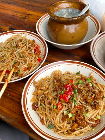 粗实的米粉煮至筋道后沥干,拌上秘制蒜蓉辣酱、香油、生抽、香醋,搭配萝卜干、酸豆角、花生米,每根米粉都裹满酱汁,酸辣鲜香,萝卜干与酸豆角的脆爽中和了米粉的软糯,口感丰富。没有大众化拌粉的厚重油腻,鲜辣不燥,一口尝到江西街头的烟火气。