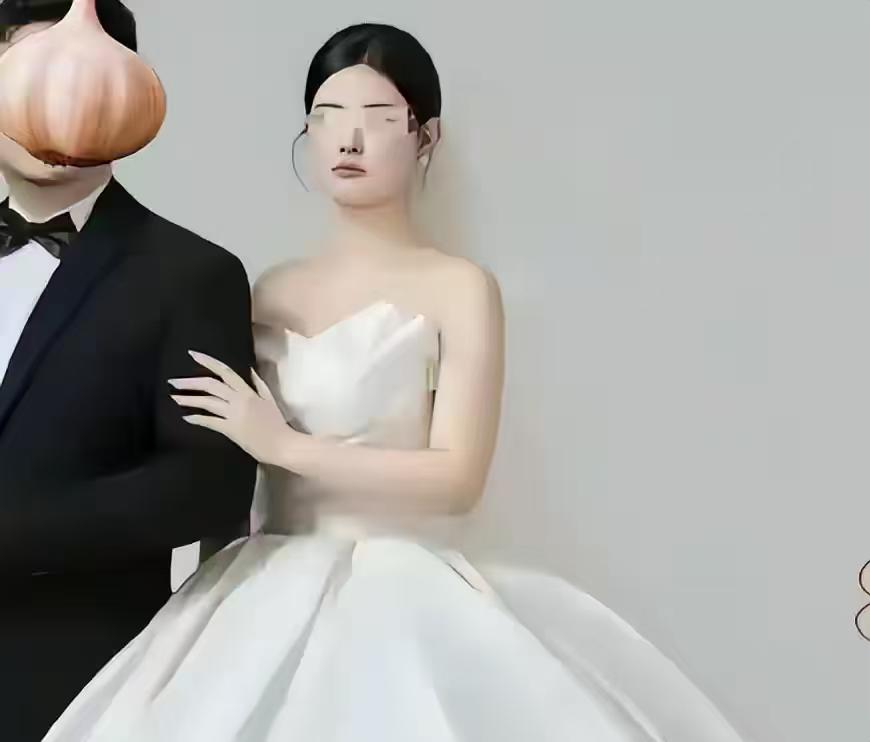 拍婚纱照时,她虽然挽着对方胳膊,但脸上没有笑容,更没有一点要结婚的喜悦。
