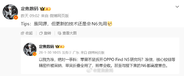 虽然技术上同源,但有博主爆料称,更新的技术还是OPPO Find N6先用,也就是说iPhone Fold上的技术是落后一代的。而且OPPO Find N6这个“更新的技术”还做到了“无折痕”,效果与CES 2026上三星展示的无折痕可折叠屏幕类似,网传OPPO Find N6最浅折痕体验至少将独占半年。