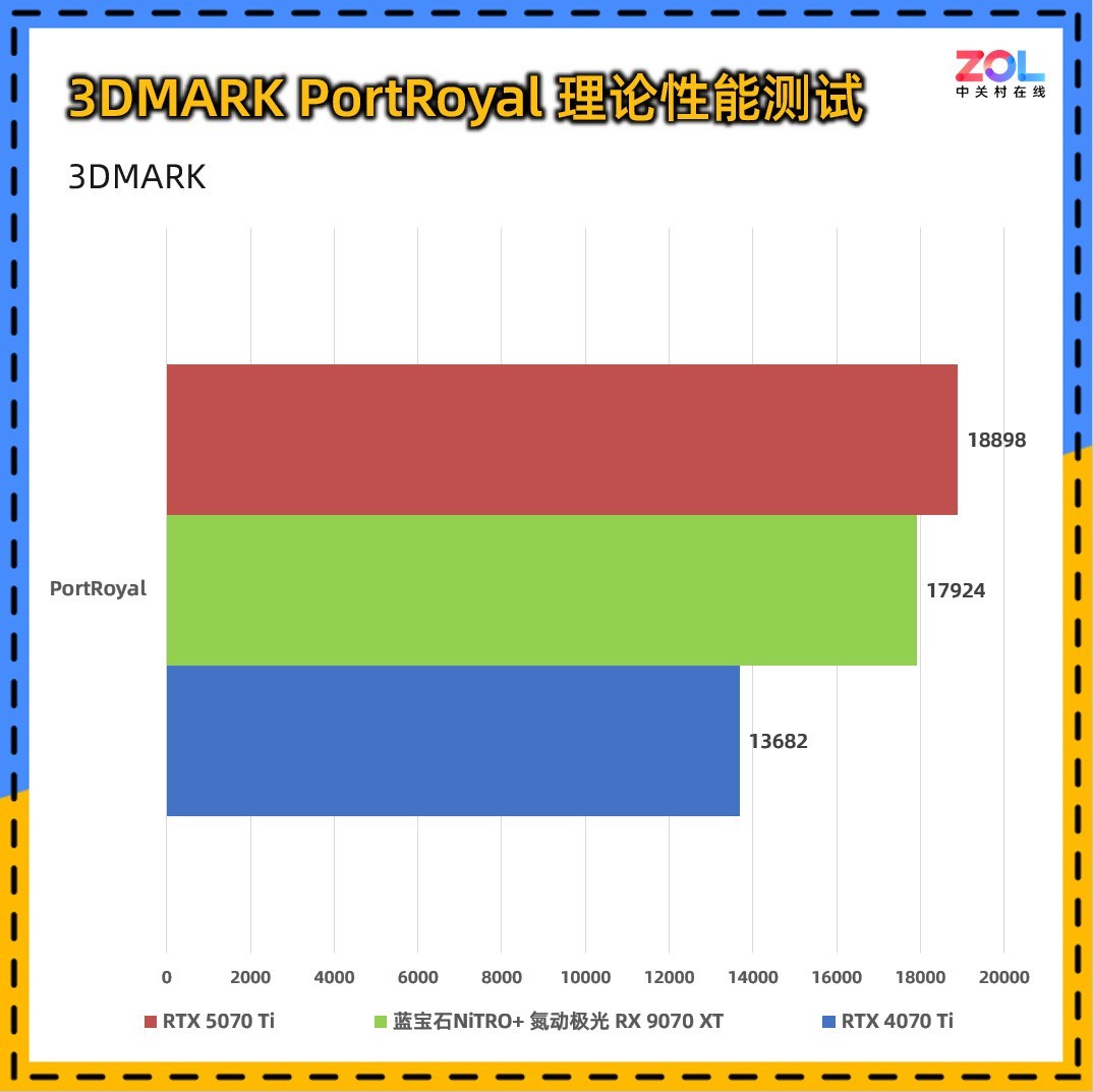 PortRoyal是专门针对光追性能的测试项,从测试结果来看,蓝宝石NiTRO+ 氮动极光 RX 9070 XT仍然有不错的性能发挥,比RTX 4070 Ti的提升明显,和RTX 5070 Ti的差距控制在6%以内。