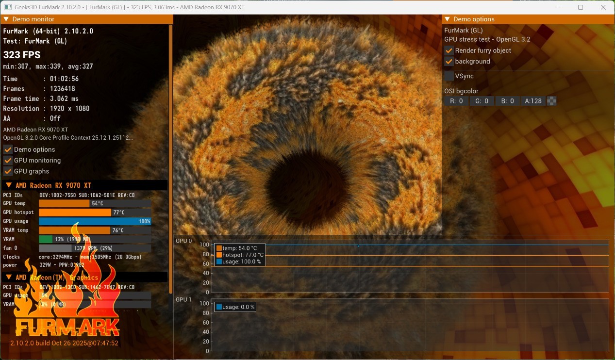 蓝宝石NiTRO+ 氮动极光 RX9070 XT的性能表现优秀,其优化散热的设计也让我们非常期待其温度表现,我们使用FurMark进行60分钟烤机测试,以检验显卡的散热能力和功耗控制。