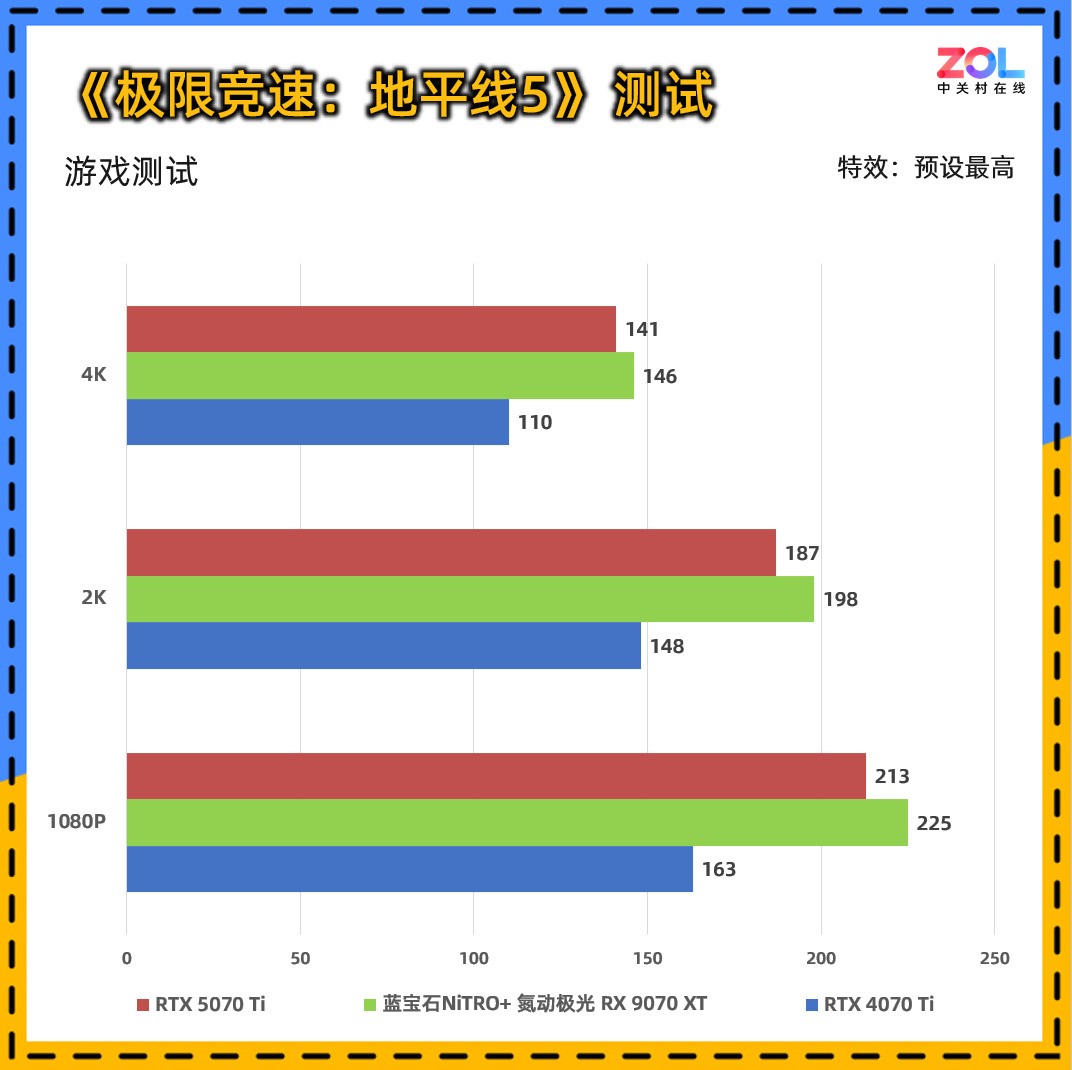 来到《极限竞速:地平线 5》的测试,蓝宝石NiTRO+ 氮动极光 RX 9070 XT再次表现出众,帧数超越了RTX 5070 Ti,在4K分辨率下仍然能达到146帧的好成绩,无论是高速飞驰还是复杂场景,都没有出现掉帧卡顿现象。