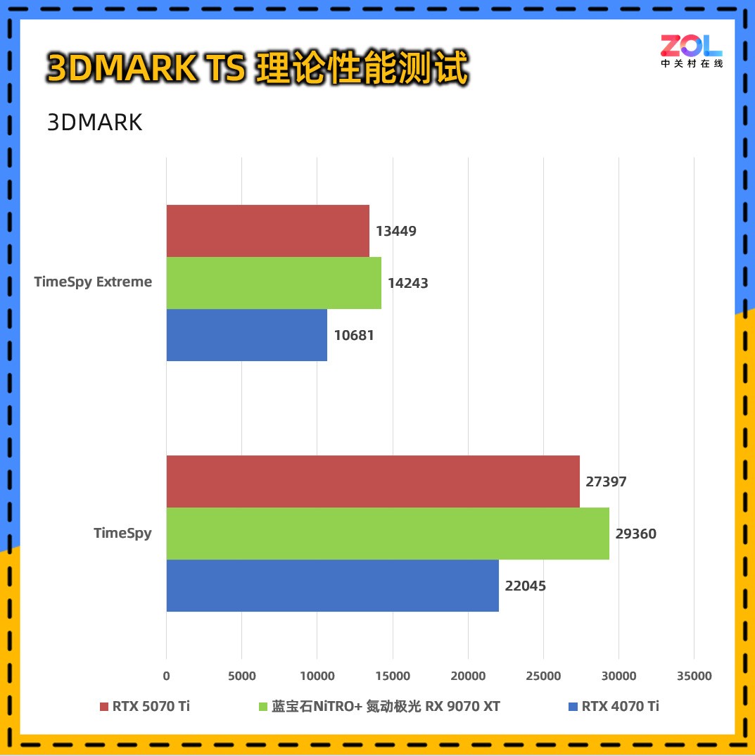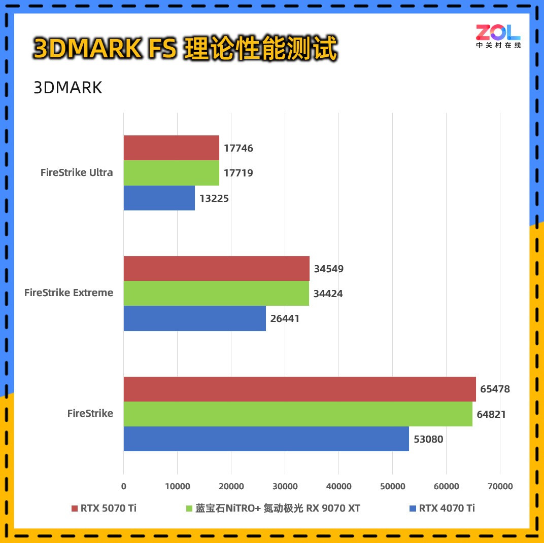 我们首先通过3DMark系列测试评估显卡的理论性能,测试涵盖DX11环境的Fire Strike套装和DX12环境的Time Spy套装,同时与同级别的RTX 5070 TI进行对比。