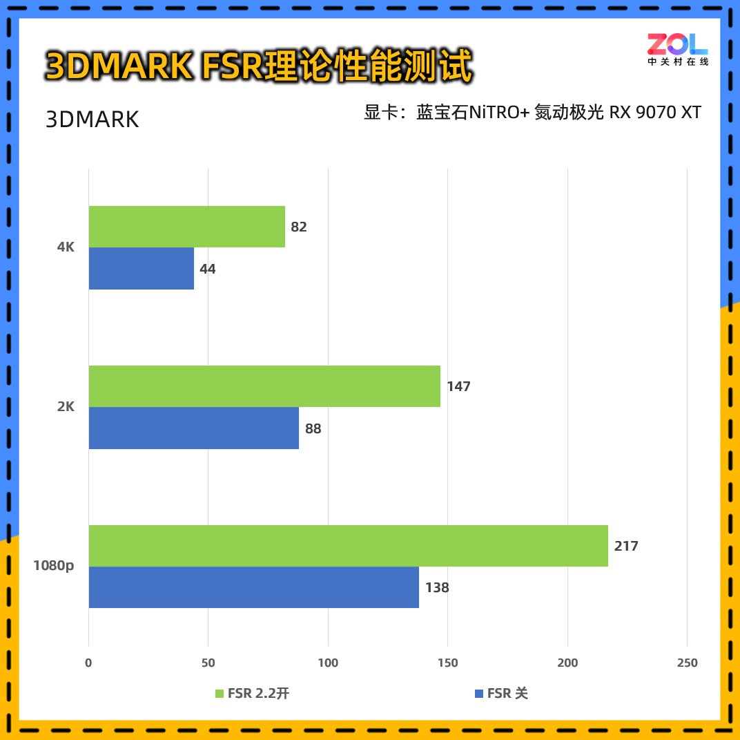 理论性能的最后是针对AMD显卡的FSR测试,从测试结果来看,蓝宝石NiTRO+ 氮动极光 RX 9070 XT的帧数提升明显,在1080p,2K和4K的分辨率下平均提升了70%,对于游戏玩家来说可以获得非常明显的帧数提升体验。