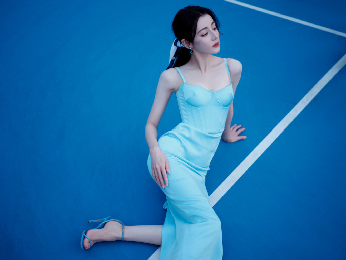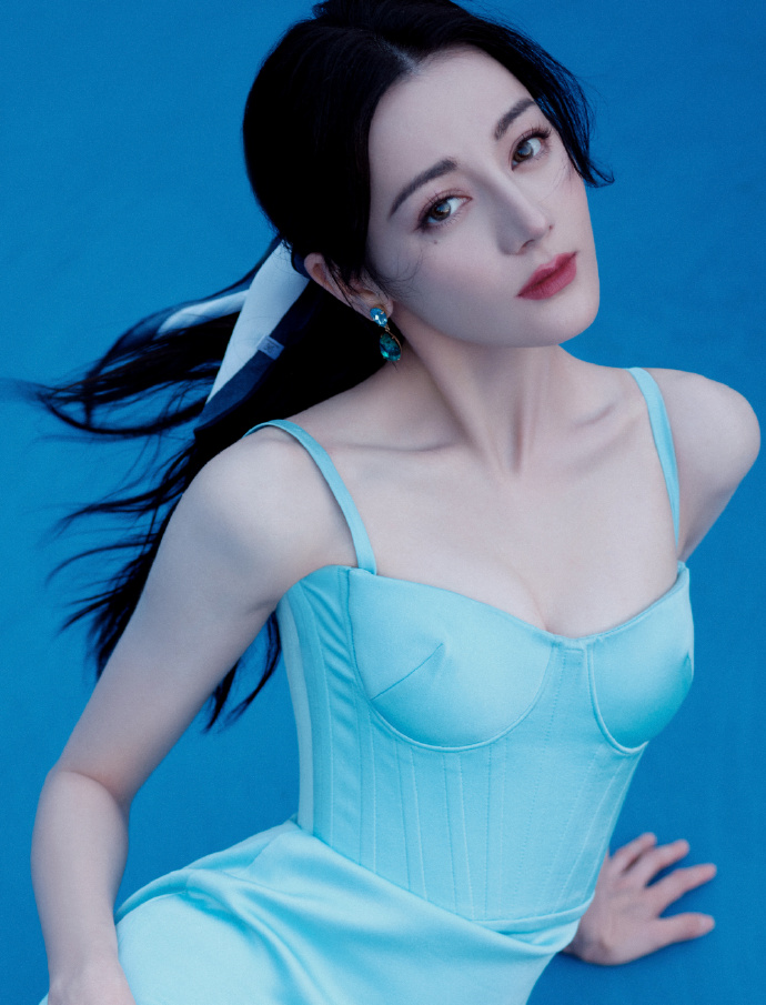 一袭冰蓝,清透如水,完美勾勒出热巴的曼妙身姿。这裙子就像是为她量身定制,每一寸都贴合得恰到好处,将她的优雅与妩媚展现得淋漓尽致。