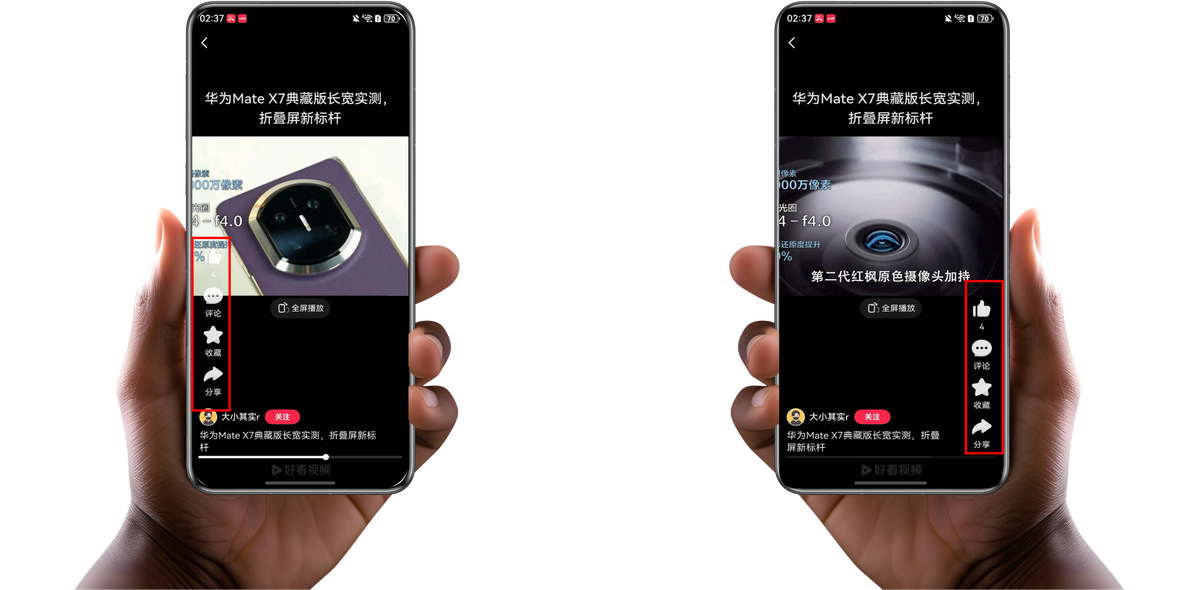 昨晚躺床上刷鸿蒙版好看视频,左手蜷着举着手机,想给看完的短视频点个赞,指尖刚抬起来就愣了一下,点赞、收藏、评论和转发按钮居然变位置了:以前都是在右边,现在自动跑到左边,大拇指不用横跨整个屏幕就能轻松点赞。