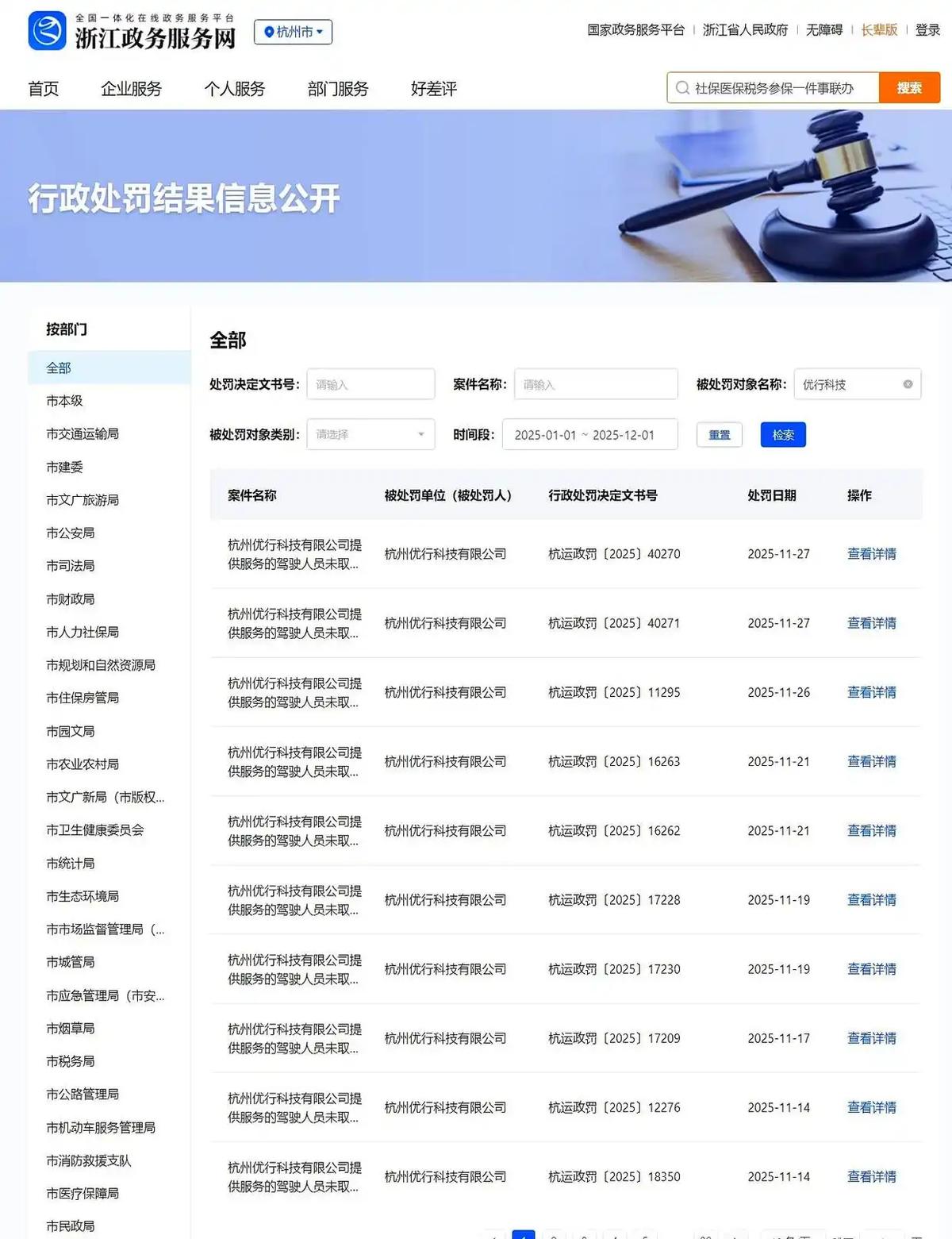公开监管信息显示,优行科技近年来因驾驶员无证运营等问题频繁受罚。据不完全统计,仅2025年以来,其在全国多地就因此类合规问题受到超过260起行政处罚。