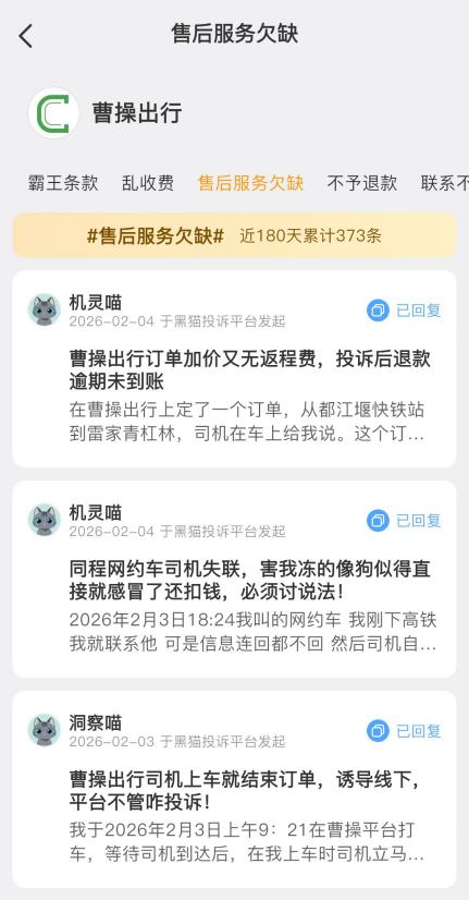 车友公社梳理发现,在第三方投诉平台“黑猫投诉”上,围绕曹操出行的安全与服务质量投诉长期大量存在,部分消费者投诉直接呼应了事故调查报告所指出的管理短板。